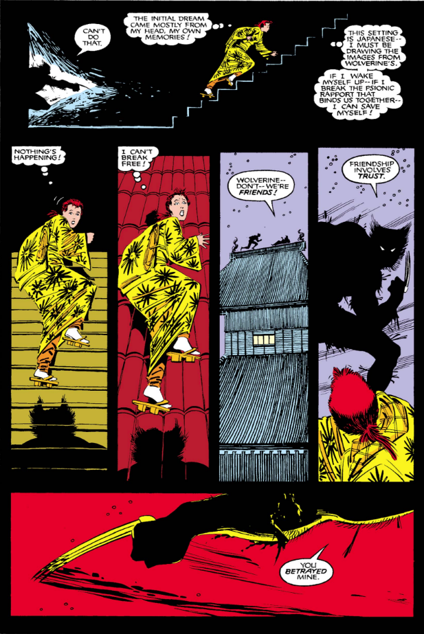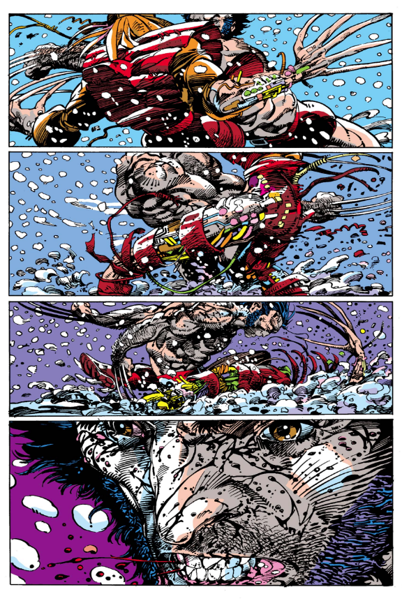 Even Wolverine, who is again struggling with his animalistic regression during this two-parter, doesn’t kill when he has the chance in this story. In fact, since Wolverine’s battle with Lady Deathstrike, he’s being drawn to look older and more tired, and it’s reflected in the script. His transition into the wise old samurai is really taking shape now, and it’s interesting to now see what triggered this transition in the character. Wolverine will eventually be revealed to be extremely long-lived, with his healing power dramatically slowing his aging. Miller’s The Dark Knight Returns starred an old Bruce Wayne many years in the future coming out of retirement as Batman, and it’s possible this is where the Wolverine as a veteran superhero concept came from. Also interesting is that years later, this idea is carried further by Mark Millar and Steve McNiven’s Old Man Logan (and this year’s movie Logan), where an even older Wolverine roams the future Marvel Universe.