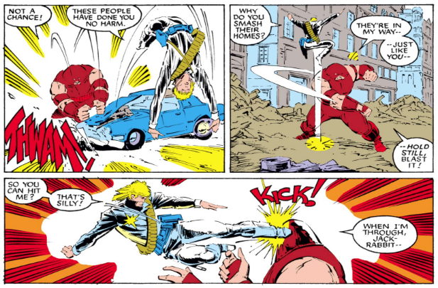 Madelyne Pryor continues to be an odd character. She was created with very strong hints that she was Jean Grey reborn following that character’s death at the end of The Dark Phoenix Saga. Then those hints were dismissed as mere coincidences, allowing Cyclops to retire from superheroing so he could marry Madelyne and then have a baby together. Fortunately those hints haven’t been forgotten. There’s even a panel with a Phoenix-like bird in flames over Madelyne during a flashback to her mysterious plane crash. Cyclops has left Madelyne to reunite with Jean Grey on X-Factor, and unbeknownst to him (I think) their baby has been kidnapped. Madelyne rightly blames Scott for a lot of this because it’s generally not cool to walk out on your wife to go hang out with your ex-girlfriend. She and Havok bond over having their significant others abandon them, and Madelyne proves herself to be tough despite having no powers.